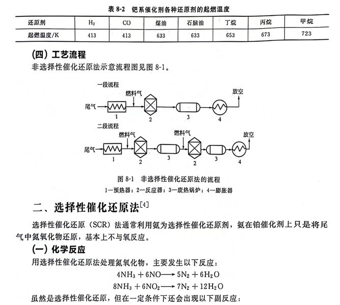 (2)預熱溫度和反應溫度 用不同的燃料氣作還原劑時,其起燃溫度不同,因而要求的預熱溫度也不同(表8-2列出了鈀系催化劑各種還原劑的起燃溫度)。如果作為還原劑的燃料氣達不到要求的預熱溫度,則不能很好地進行還原反應,脫除效果不好。